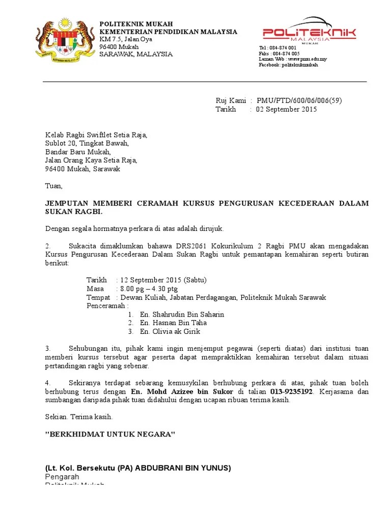 Contoh surat kiriman rasmi untuk menjemput penceramah anda boleh menggunakan contoh dan tempate di atas ini untuk menulis surat kiriman . Sukacita dimaklumkan pihak kami ingin menjemput salah seorang guru sekolah tuan. Iaitu encik norazli bin muhammad (guru cemerlang pengajian perniagaan) . Sekolah kebangsaan bukit rahmat kampung bukit rahmat, 84700, gersik, tangkak, tel : Kuliah jemputan masjid binjai bongkok, marang. Pada kebiasaanya, sekolah akan menjemput penceramah dari sekolah lain, atau dari pejabat pendidikan daerah dan ada juga dari jpn. Sehubungan dengan itu, pihak kami ingin menjemput tuan untuk memimpin bacaan doa, tahlil serta memberikan ceramah pada program ini yang diadakan seperti . Dalam pengurusan sekolah seharian guru mungkin perlu menjemput penceramah dari luar untuk datang ke sekolah. Your email address will not be published. Sehubungan dengan itu pihak sekolah berbesar hati menjemput dan mempersilakan tuan hadir untuk memberikan ceramah bagi menambahkan kekuatan, pengalaman, For more information and source see . Mohd taufik bin abd rashid. Menjemput penceramah untuk program silaturrahim mbf. Sebelum menjemput penceramah datang, perkara paling penting adalah jemputan melalui surat iaitu surat rasmi. Tuan, menjemput penceramah untuk program silaturrahim .